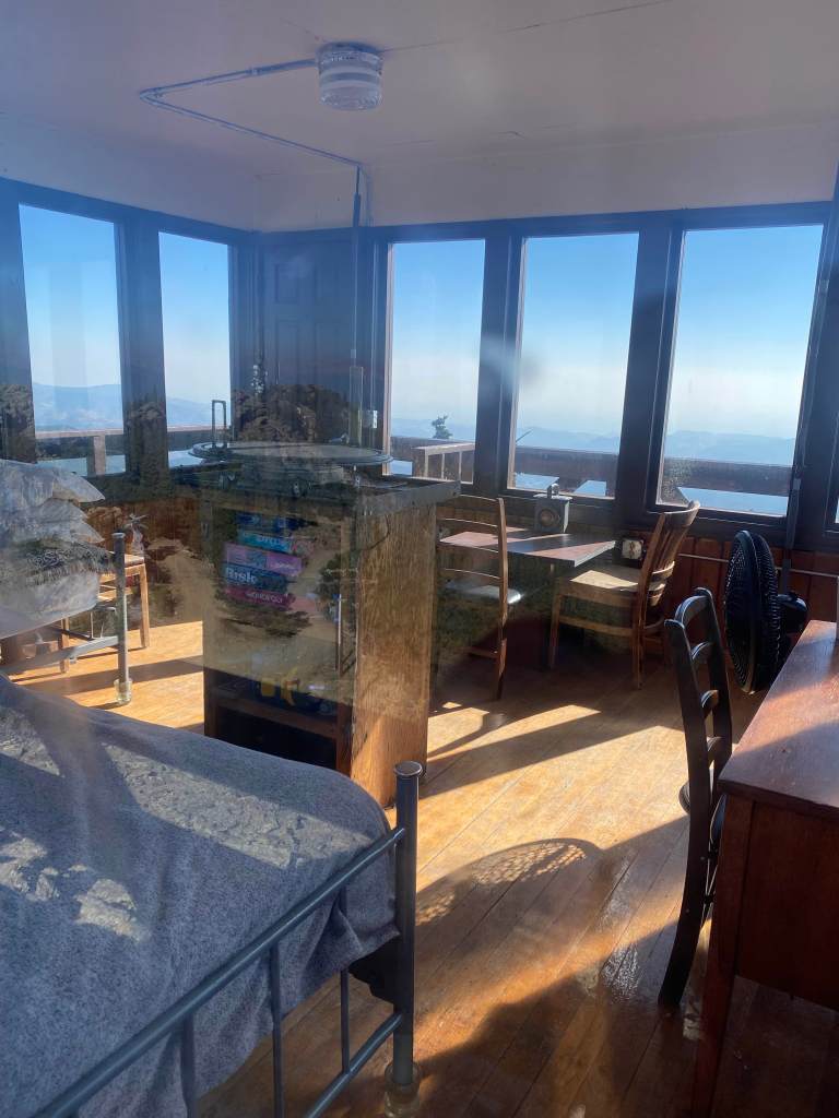 There is power running to the top of the mountain, and there is a small shelter called Fire Lookout Tower at the top. You can rent this shelter and can even spend the night there!